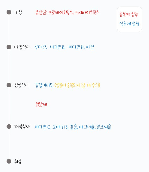 - 아연: 공복에 먹으면 속 쓰림이 있으니 식후 섭취합니다. 저녁에 먹는 칼슘을 피해 낮에 섭취합니다.